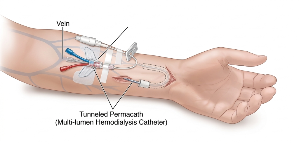 For patients who require dialysis access for a longer period but cannot immediately receive a fistula or graft, a Permacath may be inserted. A Permacath is a tunnelled catheter placed into a large vein in the neck. The catheter passes under the skin and exits near the chest, which reduces infection risk compared to temporary catheters. Permacaths allow dialysis to begin immediately, but they are still considered a temporary option until a permanent access such as a fistula or graft is created.